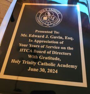 June, 2024–Attorney Gavin presented with award for serving as the Chairman and member of the Board of Directors for Holy Trinity Catholic Academy Elementary School for 17 year